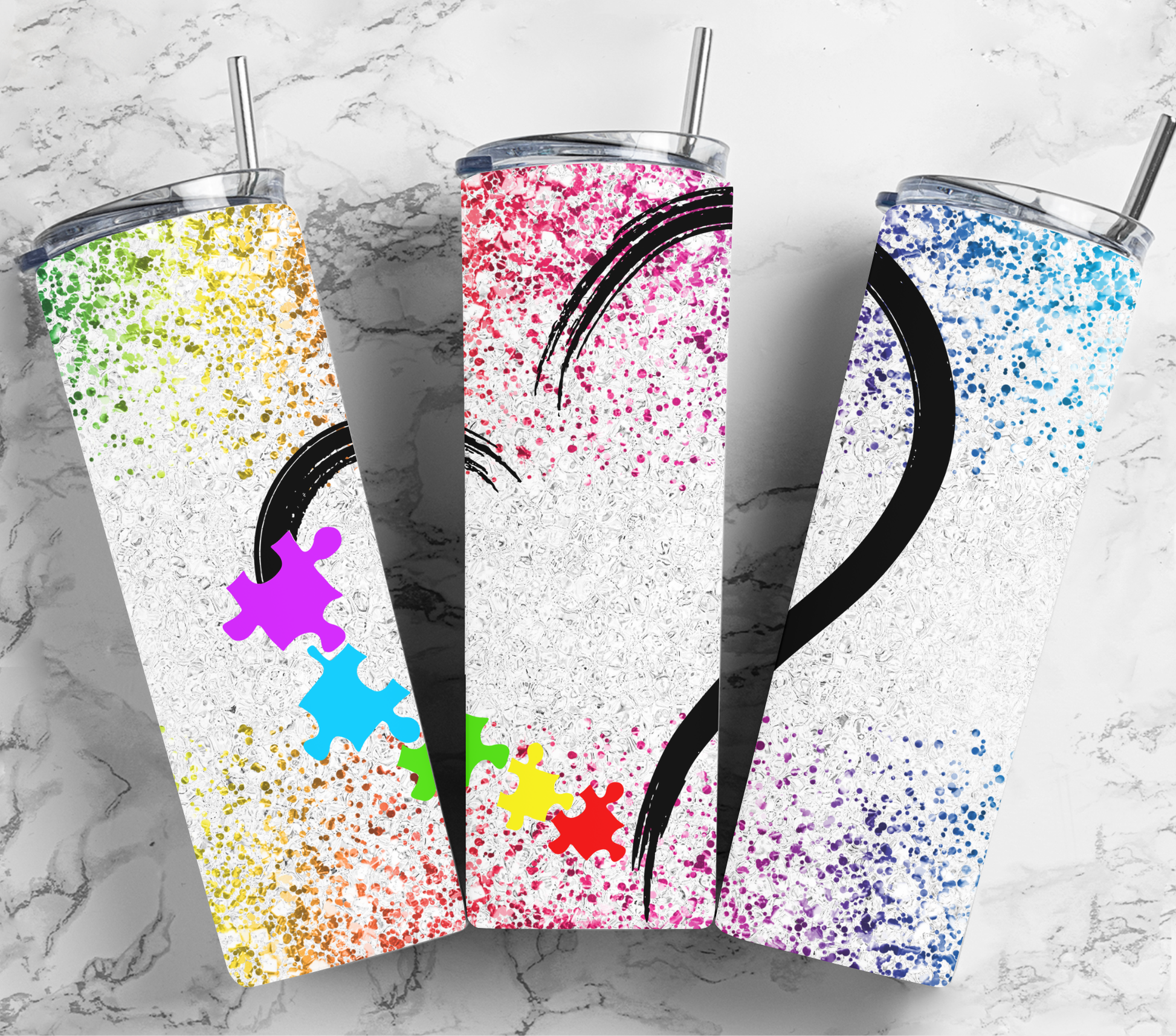 Autism heart with cute, speckled background. Handmade product made once ordered. This tumbler can have hot or cold products inside.