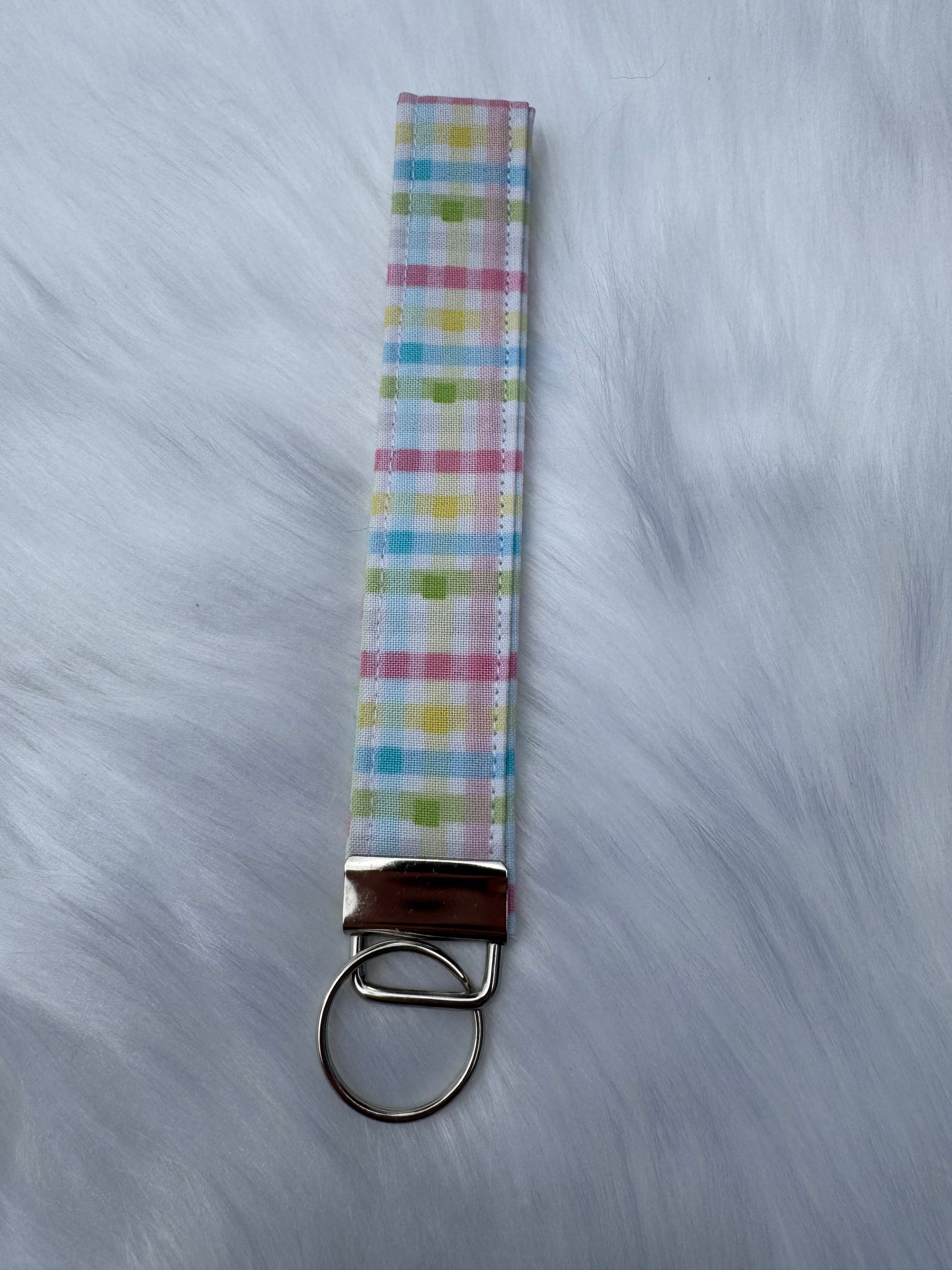 This plaid keychain is the perfect accessory for spring. The combination of pastel plaid colors pop against the white background.